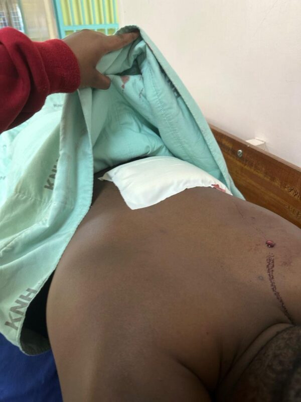 David Njoroge is now admitted to Kenyatta National Hospital with gunshot wounds to the backside, torso, and the back of his head. Photo: Sema Ukweli.